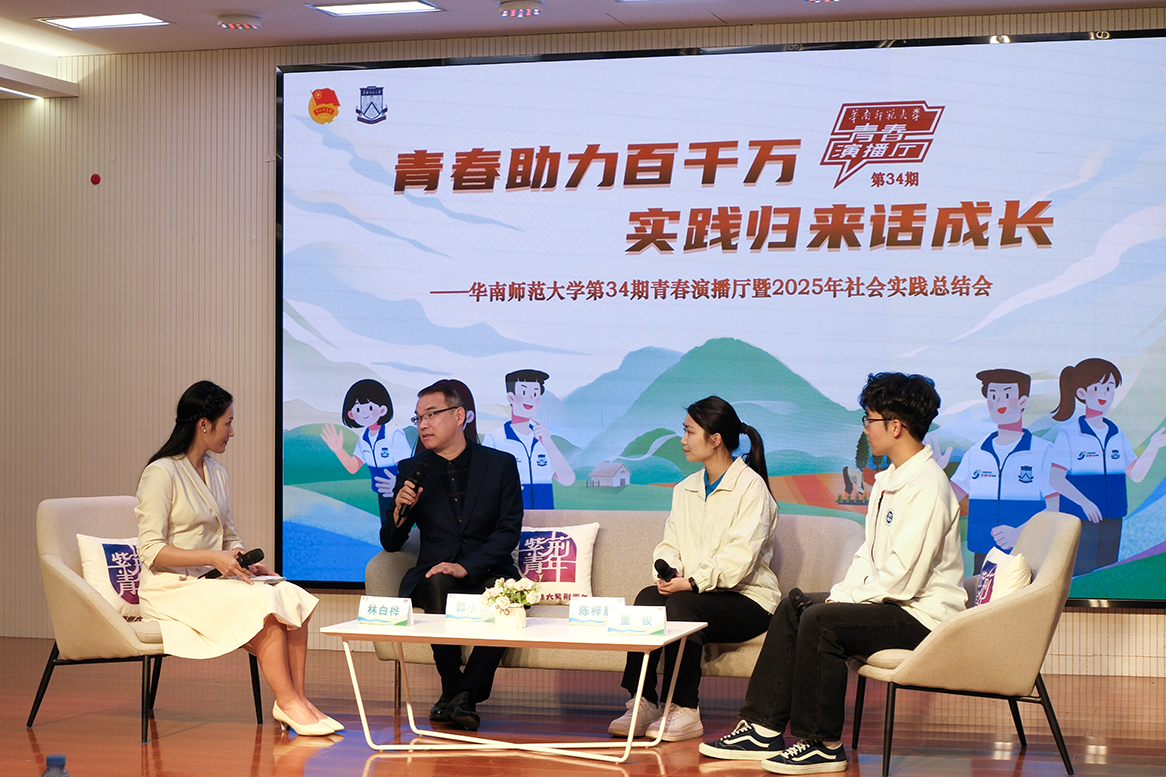 2025年11月20日,华南师范大学第34期青春演播厅暨2025年社会实践总结会在华南师范大学广州校区大学城校园举办。师生代表齐聚现场,一同回顾实践成果,倾听成长故事,凝聚青春力量。